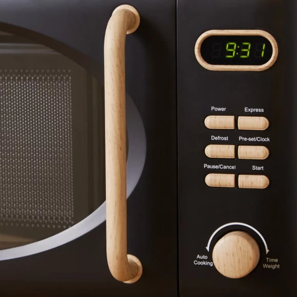 Designed with a sleek black colourway, this microwave boasts a generous 20 litre capacity with a high 700W power output. Ideal for larger family households, this microwave features a digital clock with a 60 minute timer which you can set to cook and reheat your meals, and a defrost setting suitable for all meal types and times of eating. Crafted with an easy to remove 24.5cm glass turntable, this microwave features a child lock for added peace of mind.