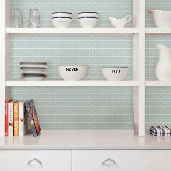 Created with a stylish brickwork design in a soft blue colourway, these peel and stick backsplash tiles are the perfect solution if you want the look of tiles without the hassle of applying them. With a high shine finish, these squares give the illusion of real brick tiles but are much easier and much quicker to apply – simply peel off the backing and stick to your wall. The shine finish also means they can be wiped clean with a damp cloth making these tiles perfect for using in the kitchen, behind sinks or above worktops to protect your walls and paint work.