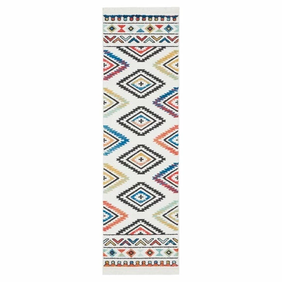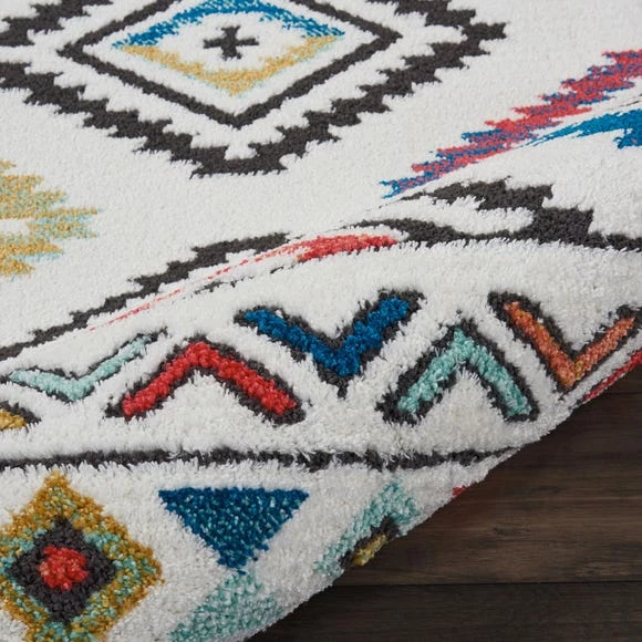 Inspired by Native American textiles, bring home a lively tribal theme with the exciting Navajo collection of rugs. Its traditional fringed trim and bright transitional hues vibrates with vivacity in this exciting multi-geometric design. Stripes filled with varying symmetrical motifs radiate out from a center medallion diamond for a striking visual effect. On receiving your rug, please unroll and leave in a warm room for 24 hours before using to reduce wrinkles and curling from packaging. Can be carefully vacuumed using a floor or brush attachment. Occasionally rotate the rug to equalise wear. Clean spills immediately by blotting with a clean, dry white cloth and do not rub. Do not pull any loose threads, please cut carefully with scissors to remove. Avoid prolonged exposure to direct sunlight.
